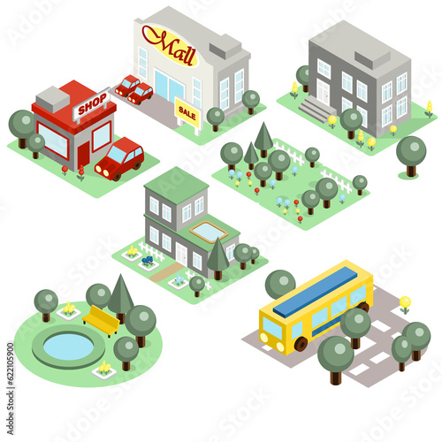 Set of the isometric city buildings, shops and other elements
