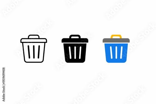 Set of three trash can icons in black, white, and blue on white background