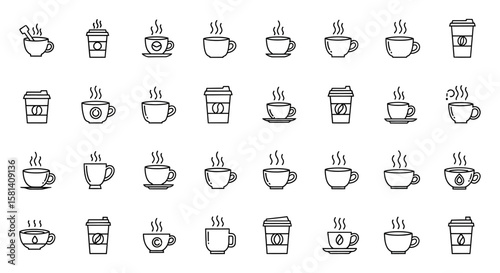 hot drink, cup, mug, take-away, beverage, drink, hot, steam, outline, line art, icon, set, collection, design, illustration, graphic, symbol, simple, minimal, black, white, cafes, espresso, latte, cappuccino, mocha, breakfast, morning, energy, caffeine, aroma, warm, liquid, container, paper, plastic, lid, handle, saucer, bean, coffee bean, kitchen utensile, food, refreshment, style, modern, flat