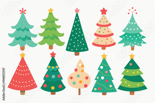 Set of watercolor christmas tree vector illustration. Collection of hand drawn cute decorative Christmas trees isolated on white background. Design for sticker, decoration, card, poster, artwork.