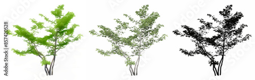 Set or collection of Mountain Maple trees, painted, natural and as a black silhouette on white background. Concept or conceptual 3d illustration for nature, ecology and conservation, strength, beauty