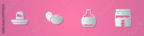 Set paper cut Mexican sombrero, Beans, Tequila bottle and Huehuetl icon. Paper art style. Vector