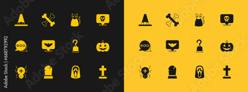 Set Skull, Tombstone with RIP written, Pirate hook, Funny and scary ghost mask, Flying bat, Black cat, Witch hat and Crossed bones icon. Vector