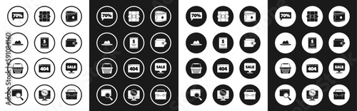 Set Stacks paper money cash, Paper check and financial check, Man hat with ribbon, Seventy discount percent tag, Wallet, Gift box, Hanging sign Sale and Shopping basket icon. Vector