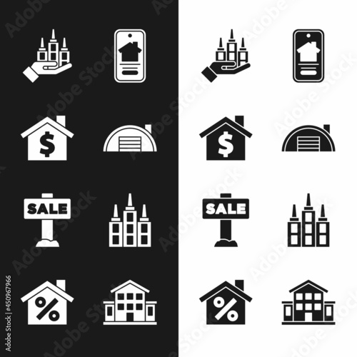 Set Warehouse, House with dollar symbol, Skyscraper, Online real estate, Hanging sign Sale, and percant discount icon. Vector