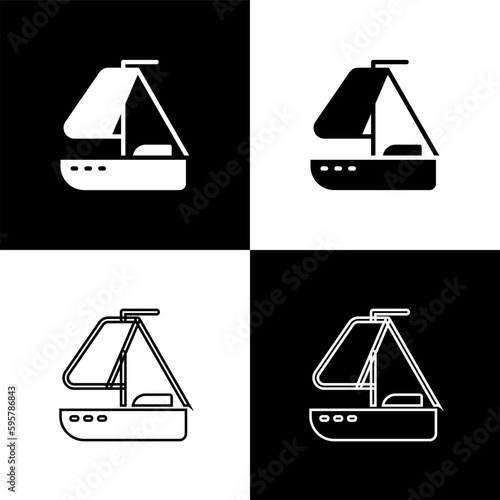 Set Yacht sailboat or sailing ship icon isolated on black and white background. Sail boat marine cruise travel. Vector