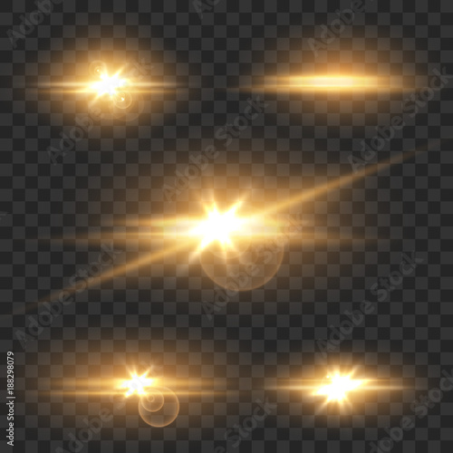Set yellow glow light lens effect sparkles on transparent background. Vector illustration.