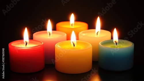 candle, light, flames, fire, dark, night, colours, red, orange, yellow, pink, teal, blue, peace, serenity, hope, remembrance, meditation, relaxation, warmth, comfort, glow, illumination, ambience, romantic, mystical, spiritual, energy, bright, vibrant, festive, celebration, holiday, beauty, still, life, object, arrangement, group, set, multiple, circle, round, wax, burning