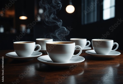 Several cups of coffee on a table in a cafe in the early morning. Blurred background. Studio style shooting. Banner, background, postcard. Copy space.