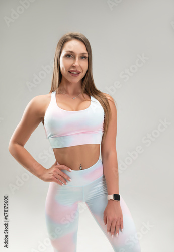 sexy athletic girl in a tight fitness tracksuit on a light background copy paste in the studio