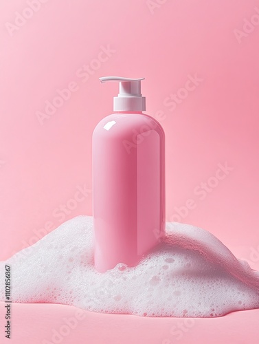 Shampoo or liquid soap packaging bottle for bathing. Cosmetics for face, body and hair care. Moisturizer, shampoo or facial cleanser on a pink background and foam.