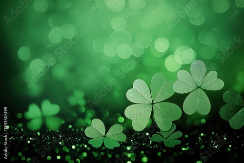 Shamrocks creating a lucky St. Patrick's Day background with shimmering green bokeh and sparkling glitter