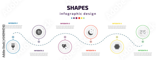 shapes infographic element with icons and 6 step or option. shapes icons such as pure love, , heart with shine, clear night, poligon, glowplug vector. can be used for banner, info graph, web,