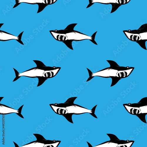Shark Isolated on Blue Background. Fish Seamless Pattern
