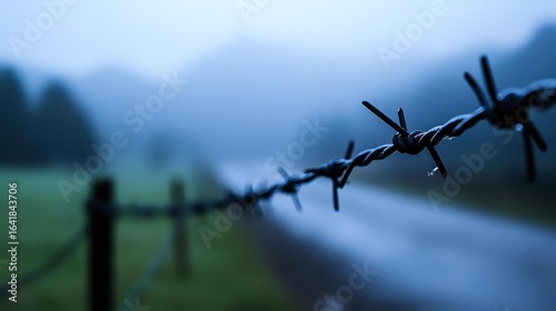 Sharp barbed wire fence stretches across misty rural landscape at dusk, creating atmospheric boundary with blurred mountain silhouettes in background.