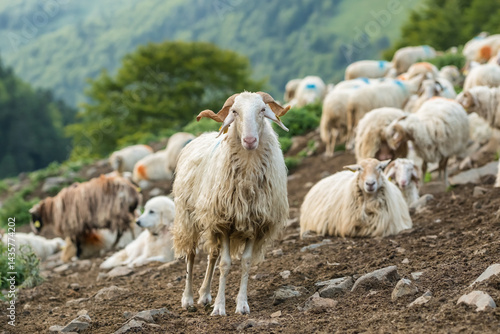 Sheep farm in the Pyrenees mountains. Cheese production in France