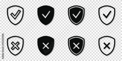 Shield check mark icon set. Protection approve sign. Safe icon. Tick and cross icons. Vector illustration on a transparent background.