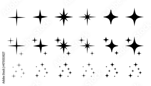 Shine sparkle star icon set. Twinkle star black silhouette for sparkle, glitter light, magic flare effect. Isolated vector illustration.