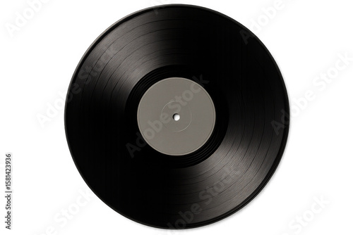 Shiny black vinyl record with blank gray label on transparent background, perfect for music-themed projects