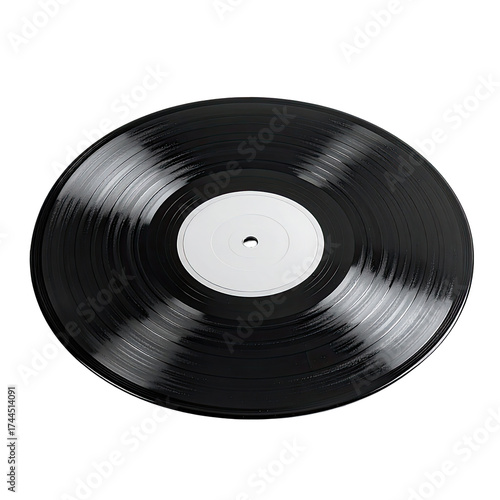 Shiny black vinyl record with white label, grooves visible. Isolated on black