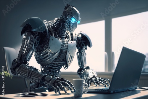 Shiny chrome exoskeleton android robot typing on a laptop. AI generated.