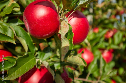 Shiny delicious apples hanging from a tree branch in an apple orchard