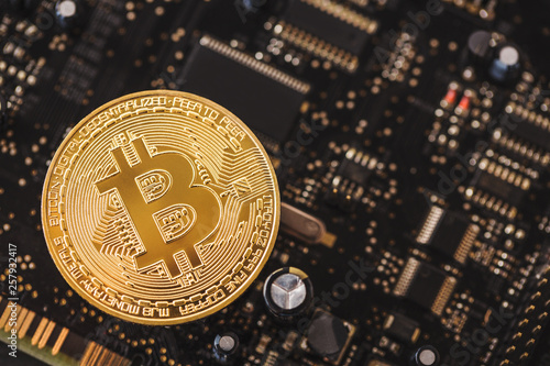 Shiny golden bitcoin on computer board