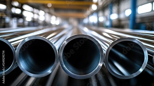 Shiny silver steel pipes arranged in a factory, highlighting their smooth, reflective surface as part of a modern industrial manufacturing process.