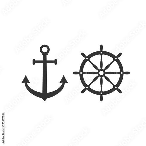 Ship steering wheel, anchor icon. Vector illustration, flat design.