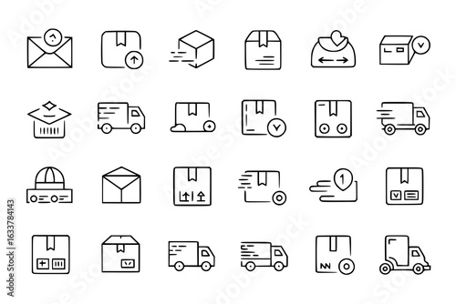 Shipping and delivery icon set. Vector line art collection of boxes, trucks, envelopes, and symbols representing logistics, packaging, tracking, and fast delivery. Minimalist black and white design el