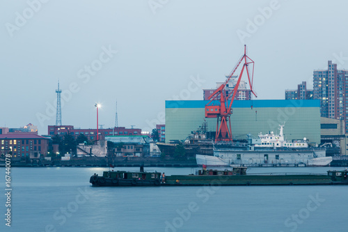 Ships on Huangpu River and cranes at the harbour,shanghai,china.