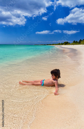 Shirtless girl playing on sea shore at beach during summer vacation, Punta Sur, Cozumel, Mexico