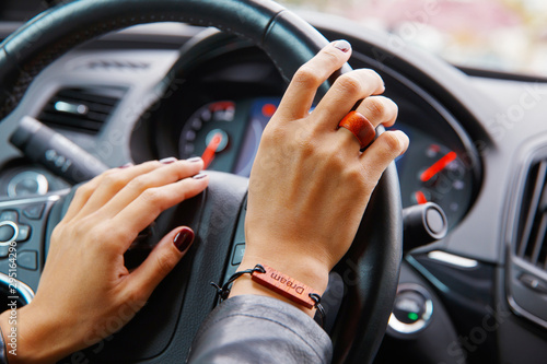 Shooting concept: girl s hands on the steering wheel of a car, a bracelet with the inscription dream on her hand.