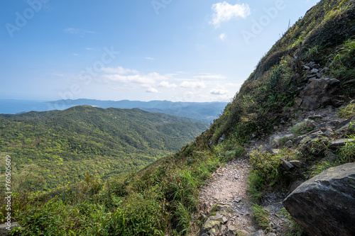 Shooting from half way of mountain trail, green mountain and blue ocean into the eyes, in Jiufen, Jinguashi, New Taipei City, Taiwan.