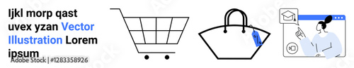 Shopping cart, handbag with tag, and customer support agent in interface. Ideal for e-commerce, online shopping, digital services, customer support, technology, retail flat landing page banner