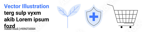 Shopping cart, shield with medical cross, and leaf icons. Ideal for e-commerce, health, eco-friendly, secure shopping, medical services, online health, and sustainability topics. Banner for landing