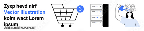 Shopping cart with number 3, vertical data storage server with multiple drawers, person watering paper-thumbs up bulbs on a head. Ideal for retail, data management, creativity, technology