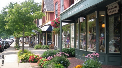 shop, sidewalk, street, town, flower, plant, green, red, brick, window, building, door, awning, signs, car, parked, leaf, tree, summer, sunlight, shadow, suppressing, pavement, brickwork, landscape, urban, outdoors, business, commercial, retail, display, facades, exterior, architecture, vintage, quaint