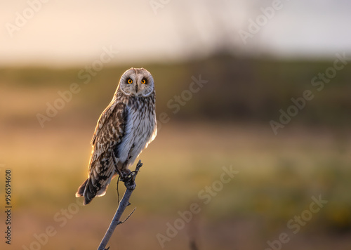 Short-eared owl perched on a small tree backlit by morning sun