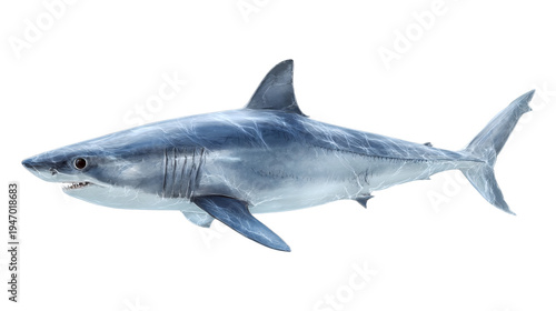 shark, fish, marin, ocean, swimming, dynamic, fast, speed, agile, predator, dorsal, fin, pectoral, fin, long, crescent, shaped, snout, pointed, conical, teeth, sharp, visible, blue, grey, silver, white, belly, counter, shading, warm, blooded, solitary, migratory, game, fishing, wildlife, nature, animal, dangerous