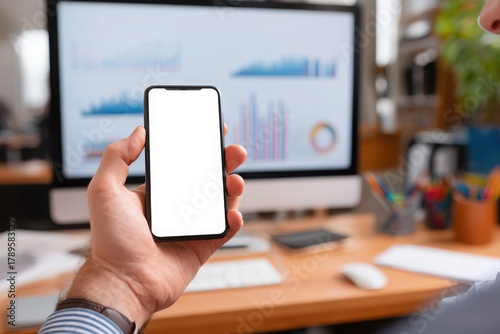 Shot of an adult man holding his smartphone with a blank white screen while sitting at an office desk and looking at a computer monitor displaying charts, close-up view.
