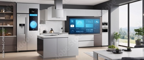 Showcase the power of the Internet of Things with a visually stunning image of a smart home filled with various connected devices and appliances AI, such as smart refrigerators, coffee makers