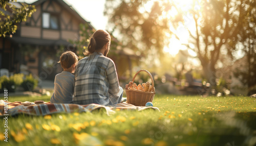 showing a family enjoying a picnic near their house, with a blanket spread on the grass and a basket of snacks, illustrating a peaceful outdoor meal, Families, relax, blurred backg