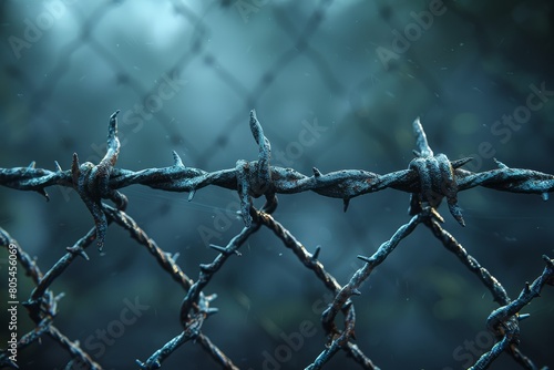 Showing close-up of barbed wire with water droplets emphasizing the contrast with the soft, blurred background