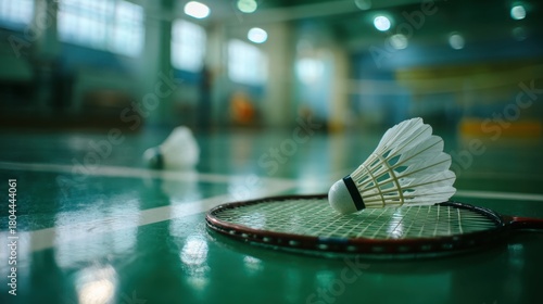 Shuttlecock and Racket on Court: A close-up shot of a badminton shuttlecock resting on a racket, ready for a match, alongside another shuttlecock in a blurred background.