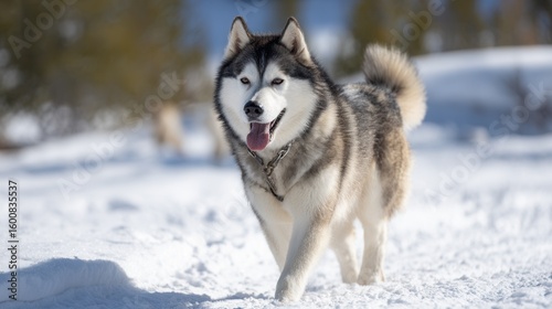 Siberian husky walking on snowy landscape with trees in background.