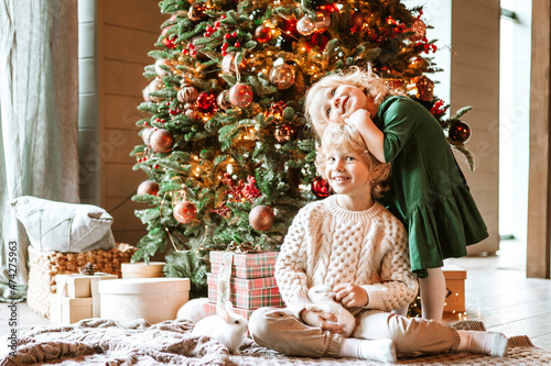 siblings children boy and little girl with blond hair and blue eyes in beautiful clothes are standing in living room near Christmas tree with white small rabbits for family celebration of Christmas an