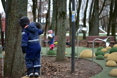 Siblings playing with a playground toy telephone made of metal tubes. Children communicate from a distance, exploring sound and imagination during creative outdoor play in an autumn park.