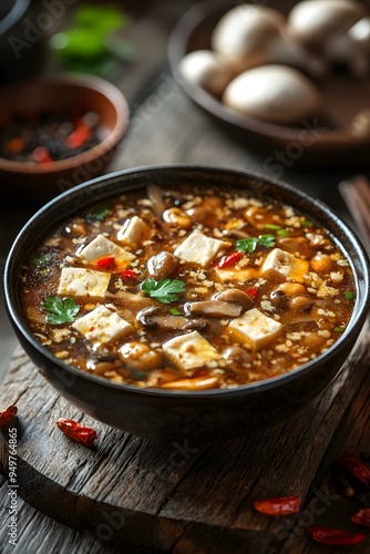 Sichuan Hot and Sour Soup - A spicy and tangy soup made with tofu, mushrooms, and bamboo shoots, flavored with vinegar and white pepper..
