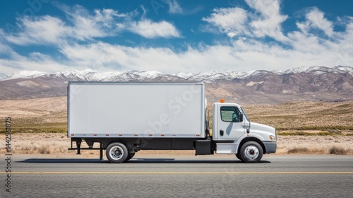 Side profile of a white delivery truck driving along an empty highway, clean cargo area ideal for marketing and branding